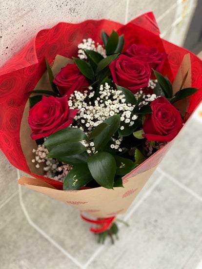 Bouquet de 5 Roses (coloris aux choix) , Gypsophilde et son feuillages en fonction des saisons